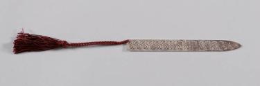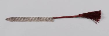 Physical DescriptionPhysical DescriptionSIlver-toned metal letter opener with a repeating rounded lattice design in the center and a corded maroon tassel at the end.