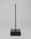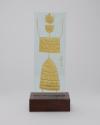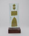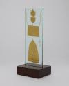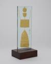 Physical DescriptionPhysical DescriptionGlass rectangular sculpture on a wood base that depicts a woman balancing a jug on top of her head etched in gold. The woman's limbs are thin lines and she wears a rectangular gold-checked top and skirt with floral and geometric designs. Her arms point upward.