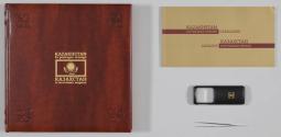 Physical DescriptionLeather-bound stamp album containing postage stamps of Kazakhstan along with descriptions of Kazakhstan and of each of the stamps. The front cover has the title printed in gold in English and Kazakh around a Kazakhstan flag with a stamp border. The corners of the cover contain debossed fleur de lis-like designs. The stamp album came with an additional postage stamp information booklet (.b), a black and silver magnifying glass (.c), and silver-toned tweezers (.d).