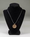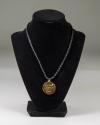 Physical DescriptionGold-toned medallion on a black cord with the inscription "One God Unites Us" on the back.