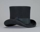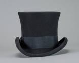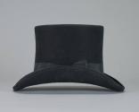 Physical DescriptionBlack felted wool top hat with high curves on either side of the brim. The hat band is a black ribbon with a bow on the proper left. At the bow there is a metal charm with the brand name. The interior sweatband is black leather.