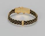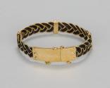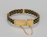 Physical DescriptionPhysical DescriptionBraided bracelet with woven black plastic filaments and gold-toned metal. The clasp of the bracelet is inscribed with the word "Sasha" and has a hanging chain.
