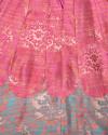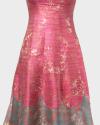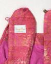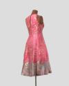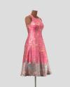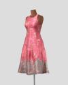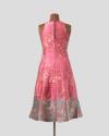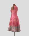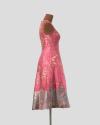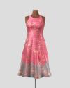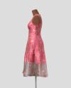 Physical DescriptionSleeveless pink berry, gold, and cream floral rough-hewn silk jacquard knee-length dress with contrasting scalloped border of turquoise, cream, and orange floral silk jacquard around the hem. There is a pink layer underneath.