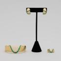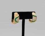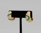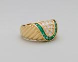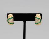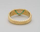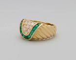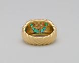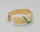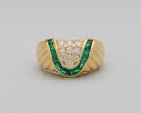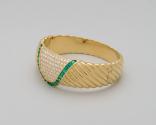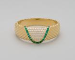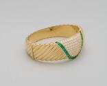 Physical DescriptionGold jewelry set with emeralds and diamonds. Jewelry set includes a bracelet (.a), ring (.b), and set of earring (.c, d). Each piece has a ridged design, and the emeralds are set in a u-shape, with the diamonds filling the space.