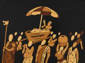 Physical DescriptionPhysical DescriptionCut-out pieces of different colored woods that depict a group of people in a minimalistic style. There is a person riding in a palanquin at the center of the piece, a person carrying a basket towards the bottom right, and a person carrying a staff at the bottom left. The pieces of wood have been adhered to a separate piece of wood that has been painted black to act as the background.