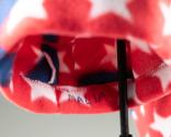 Physical DescriptionLong fleece hat that tapers to a point with a white pom-pom on the end. The fabric has a red background onto which white stars and blue eagles are imposed. "MALIA" is hand-embroidered on the inside of the band.