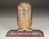 Physical DescriptionPhysical DescriptionSilver-toned metal plate that is a three dimensional depiction of an Egyptian cartouche containing "Obama" in English and hieroglyphs. On the reverse of the sculpture is an etching depicting President Obama's face. Decorative motif around the edge of the oval cartouche. The metal plate is attached to a wooden base that is inscribd on two sides.