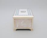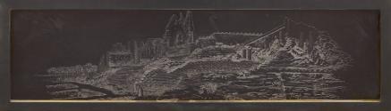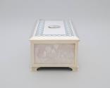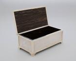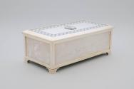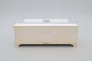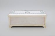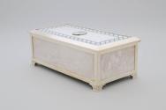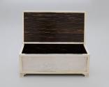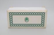 Physical DescriptionPhysical DescriptionSterling silver box with green border and the Saudi Arabia insignia (a palm tree and two swords flanked by two eagle wings and Arabic script on the outside) in the middle. On each side there is an engraved scene. From right to left is; an engraving of a offshore refinery, a scene of hills and old brick buildings and an engraving of a city with mountains in the background. The interior of the box is lined with wood panels.