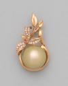 Physical DescriptionPhysical DescriptionChampagne-color pearl pendant with a rose gold backing in a vine design. Three of the leaves are studded with round faceted diamonds, surrounding a pink-colored diamond.
