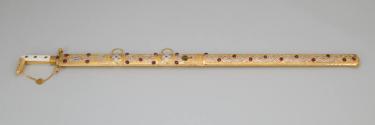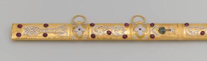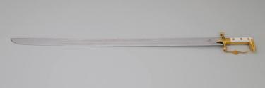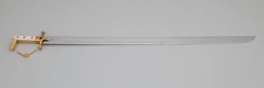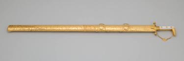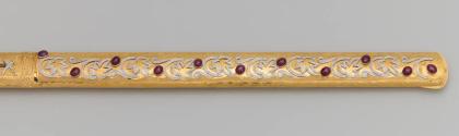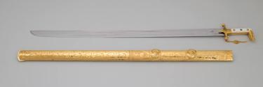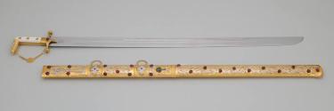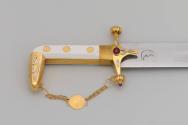 Physical DescriptionPhysical DescriptionTraditional sword (.a) and sheath (.b) with gold and gemstone decorations. The sword has a curved gold and white hilt with a curved decorated gold pommel. A crescent moon design is engraved on the forte where its attached to the hilt.The sword guard is decorated with inset rubies and diamonds. Attached to the hilt is a gold chain connecting the guard with the curved tip of the pommel.