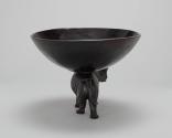 Physical DescriptionPhysical DescriptionCarved dark wood decorative bowl with a foot in the shape of a rhinoceros. The bowl rests on the back of the rhinoceros which is carved with lined details throughout the body and has two green rhinestones for eyes.