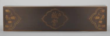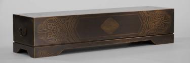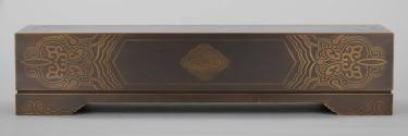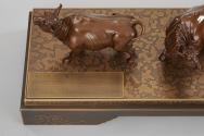 Physical DescriptionA bronze sculpture (.a) of five oxen standing atop a raised bronze base. The oxen are all looking in different directions and are based on the "Five Oxen" handscroll painting by Han Huang, a prime minister during the Tang Dynasty. There is a plaque describing the "Five Oxen" handscroll painting and its cultural importance at the bottom left corner of the base, with half of the plaque written in English and half in Chinese. Along the edges of the sculpture's base are dragon and flower motiffs, and on the footed base there is a swirling wave-like design. The lid (.b) is bronze and has a dragon design at the center of each long side, oxen on the left and right side of the top, and traditional Chinese designs throughout. Each short side of the lid has a handle and the interior is lined with red fabric.
