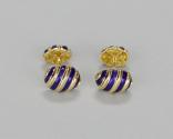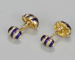 Physical DescriptionPhysical DescriptionSet of gold cufflinks with rounded oval-shaped faces and toggles that have a diagonally striped gold and blue enamel pattern. The posts have a slight angle and the toggles are fixed in place.