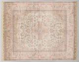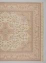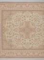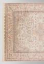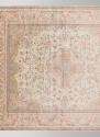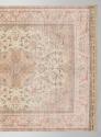 Physical DescriptionPhysical DescriptionPakistani rug in light pink, dark red, yellow, black, green, blue, and beige hues. The rug has floral and vegetative designs throughout. The sheen of the silk fibers gives the appearance of the rug being silvery light from some angles, and darker yellows from others. At the very center of the rug is a series of concentric flowers which move outward to different swirls of leaves, vines, and flowers. A series of rectangular edges block off a second floral pattern toward the sides of the carpet. At both short ends there is a row of yellow with repeating flowers and white fringe.