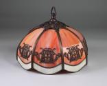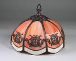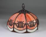Physical DescriptionPhysical DescriptionStained glass lampshade with bronze-colored metal decorative fixtures. Each panel is petal-shaped with a orange marbled body and white border around the lower edge, and an ornamental brass-colored metal fixture in the center. Hangs from a metal loop at the top. There is a black plastic lightbulb socket inside.