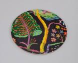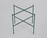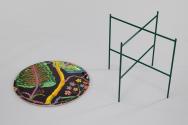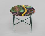 Physical DescriptionSvenskt Tenn Stockholm-brand tray table consisting of a wood tray (.a) with a multicolor botanical pattern on a black background from the Tree of Life collection that rests on an emerald green metal stand (.b). The stand is hinged at the center point and can be collapsed.