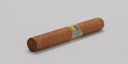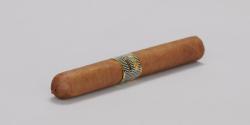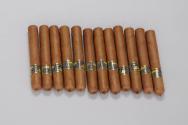 Physical DescriptionSet of twelve double robusto 56 gauge Cohiba Behike Cuban cigars each with a wrapped brand band at the end. The cap is twisted. The band has the brand logo of a human silhouette in holographic gold.
