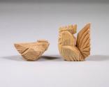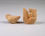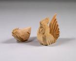 Physical DescriptionTraditional Japanese wood carvings crafted in the Iso ittobori technique that depict Shinkei, or sacred rooster. The larger carving depicts a rooster and the smaller depicts a hen.