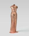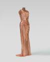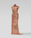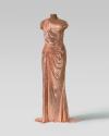Physical DescriptionPhysical DescriptionCustom rose gold chainmail gown with an asymmetrical neckline, off the shoulder strap, draped details at the bodice and split skirt. The internal gown structure contains a full boned silk bodice and silk inner skirt lining of the same color.