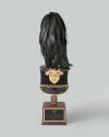 Included with the hat is a wooden display stand (.c), comprised of a square base and circular pedestal. The circular pedestal is incised with a diamond pattern, and there is a brass band at the top and bottom. Affixed to the front of the stand is a metal plaque.