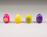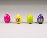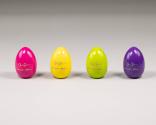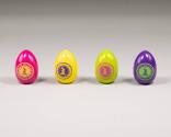 Physical DescriptionPhysical DescriptionFour wooden Easter eggs of varying colors (.a-d). On each of the eggs is an image of a rabbit running (upright) surrounded by twenty-seven stars in a circle. Surrounding the image and stars is text, with a border on the outside. The back side of the eggs have the printed signatures of the First Lady and President. The color combinations are as follows: The green egg has pink text; the pink/magenta egg has yellow text; the yellow egg has purple text; and the purple egg has green text.