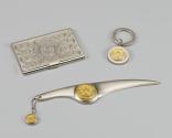 Physical DescriptionThree part desk set with a business card case (.a), letter opener (.b), and a keychain (.c). All pieces have a Silver-toned body. The card case has an engraved floral design while the letter opener and keychain have a gold-toned medallion featuring a flower design embedded in the center.