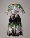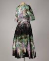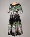Physical DescriptionPhysical DescriptionBlack dress with print of purple and white wisteria, green trees, and water birds. Pattern has decorative gold accents. The dress has a fitted bodice, elbow length sleeves, and a full skirt.