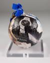 Physical DescriptionPhysical DescriptionA silver ball ornament with papier-mâché images of various company logos and words, with random images of people. Attached along the silver metal ring at top is a blue ribbon with embroidered yellow text.