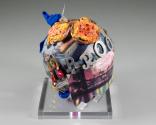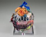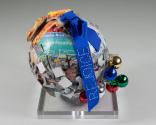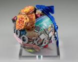 Physical DescriptionPhysical DescriptionLarge red ball holiday ornament decorated with papier-mâché images of Brooklyn landmarks and well-known people. Several three-dimensional elements are attached to the surface including mirror squares, silver foam letters spelling BROOKLYN, clay sculptures that look like pizzas, a plastic figurine of a man holding shopping bags and a base of multi-colored smaller Christmas ball ornaments. The blue ribbon on top is stitched with the word REJOICE in white.