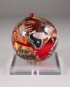 Physical DescriptionPhysical DescriptionLarge red large ball ornament is decorated in papier-mâché images of people, places, and things associated with the State of Texas, including pecans, football, rodeo, tractors, baseball, and other assorted sports. Glitter throughout.