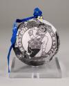 Physical DescriptionPhysical DescriptionLarge bauble ornament decorated with black and white papier-mâché images related to peace, the holiday season, and the Boston Celtics basketball team. Blue ribbon attached at top is painted with glitter paint.