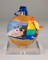 Physical DescriptionPhysical DescriptionLarge bauble ornament painted primarily gold with a color block depicting a sandy beach and the ocean at sunset. The bottom color is blue with adhered gray paper to create waves, the middle color is a sea foam green, and the upper color is yellow. In gold-toned glitter the word "Malibu" covers on side. To the upper left of the words there is a large sun made of paper and pipe cleaners. On the reverse there is an attached image depicting a Malibu beach. Attached at the top is a blue ribbon embroidered with the word "rejoice" in yellow thread.