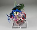 Physical DescriptionPhysical DescriptionLarge red ball holiday ornament decorated with an assortment of materials, including artificial pine garlands, a clay figurine wearing a Carnival mask and outfit, glitter spirals, ribbon, feathers, and stickers, all presenting a Mardi Gras / Carnival theme. Images of the French Quarter in New Orleans, Louisiana are adhered to the ball. There is a blue ribbon attached to the top.