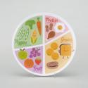 Physical DescriptionPhysical DescriptionPlastic plate with four printed sections in different colors featuring cartoon foods with smiling faces from four categories: protein, grains, veggies, and fruit. The sections are proportional to demonstrate the quantities that should be eaten for a nutritional meal.