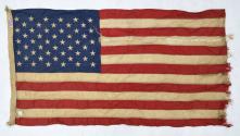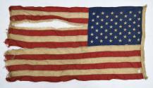 Physical DescriptionPhysical DescriptionAn American flag with embroidered stars in the canton. The flag features fifty embroidered white stars on a blue canton, with thirteen alternating red and white stripes. The hoist end of the flag consists of a canvas header. The original metal grommets on the header are destroyed or missing.
