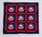 Physical DescriptionPhysical DescriptionNavy blue quilt with the red, white, and blue Obama for America rising sun logo in nine segmented squares, separated by a red border. Edge trim of the quilt is a lighter shade of blue. Reverse top left corner has a stitched inscription.