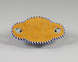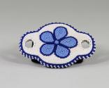 Physical DescriptionPhysical DescriptionWhite and blue Native American hair ornament made with glass beads. The center has a flower design in blue, surrounded by white, with an alternating blue and white beaded edge. The reverse of the ornament is leather. There are holes on each side for a pin to go through, but no associated pin.