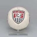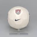 Physical DescriptionA white soccer ball made of pentagonal and hexagonal pieces of synthetic material sewn together. The ball is encircled by a printed navy blue stripe with an oval opening on opposing sides. Inside the ovals are two blue stars. Printed on the ball is the large logo for USA Soccer, consisting of a shield bordered in blue and gold, with a soccer ball streaking through the center, between U and S. The opposite side features a smaller USA Soccer logo, with a larger Nike logo below it. Manufacturer information is printed on the bottom.