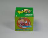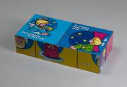 Physical DescriptionToy puzzle box composed of eight connected cubes that form a single large cube and unfold to reveal scenes depicting a child going to sleep. Polish words on each scene correspond with a line from a nighttime prayer.