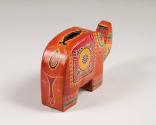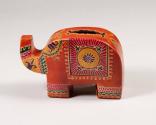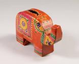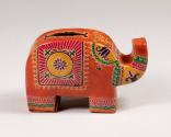 Physical DescriptionPhysical DescriptionA toy bank made from embossed orange leather in the shape of an elephant. There is a snap closure on the back foot with a flap that opens to remove money. The body of the elephant is decorated with colorful designs.