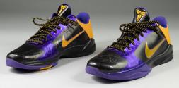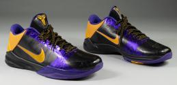 Physical DescriptionA pair of purple, yellow and black Nike Zoom basketball shoes signed by Kobe Bryant in silver ink.