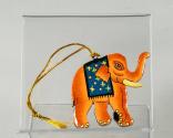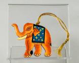 Physical DescriptionPhysical DescriptionPainted orange wooden Christmas ornament in the shape of an elephant. The elephant has a blue painted blanket on its back and it hangs from a gold-colored cord with fringe at the top.