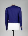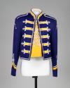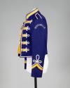 Physical DescriptionMilitary style marching band jacket in purple, yellow, and white, with gold buttons. Body of the jacket is purple with yellow stripes at each button and white swirling piping around the stripes. An additional yellow stripe and white piping is at each wrist. The center of the jacket has a white faux jabot with yellow on the ruffles and a yellow cumberbun sewn at the waist. The buttons have a debossed design of a harp. Embroidered at each shoulder in white is the word "Rochelle".