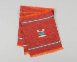 Physical DescriptionWoven orange cotton tablecloth and napkin set. Each napkin has a different traditional African symbol in the center, white and teal stripes on both ends, and fringe. Similar symbols and other motifs are reflected on the tablecloth, which is also fringed. The napkins are sewn together.