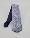 Physical DescriptionPhysical DescriptionHand painted navy blue silk tie with a blue and pink cloud design and a wavy pattern overlaid on top of it.