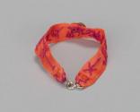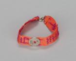 Physical DescriptionPhysical DescriptionOrange ribbon bracelet with magenta embroidered designs and sterling silver medallion attached to the center.