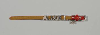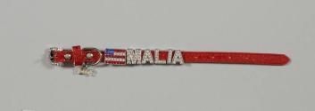 Physical DescriptionRed glitter leather bracelet embellished with silver charms with inset clear rhinestones that spell "MALIA" with a red, white, and blue U.S. flag charm. Closes with a buckle clasp embellished with rhinestones.