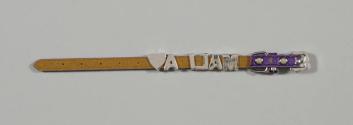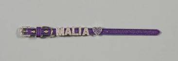 Physical DescriptionPurple glitter leather bracelet embellished with silver charms with inset clear rhinestones that spell "MALIA" with a purple rhinestone heart charm. Closes with a buckle clasp embellished with rhinestones.