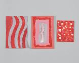 Physical DescriptionA set of three paintings with one painting featuring red and gray wavy lines with "USA" in the center and "Christopher N." written on the reverse in pencil (.a), one featuring red, pink, and gray rectangles with a white and pink squiggle in the center (.b), and one featuring white and pink polka dots on a red background (.c).