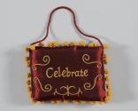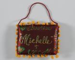 Physical DescriptionA red pillow door hanger with gold puff tassels along the edges and green red cord at the top. On one side of the pillow there is gold and green glitter glue writing that reads "Michelle + Mom" at the center and "[heart] Brother Daughters" along the edges of one side. "Celebrate" and spiral designs are embroidered on the other side.